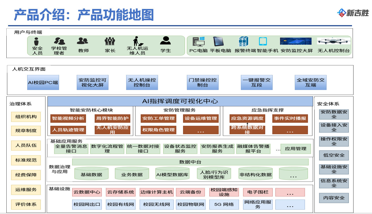 定位:以 “算力赋能行业,AI 构筑校园全维度智能防护” 为使命,新吉胜 AI 校园地空安防协同系统打造 “算力 + AI + 校园地空安全” 创新模式,构建全域覆盖、全栈智能的校园安防体系。依托 AI 算法、物联网感知与无人机协同技术,实现 “毫秒级预警、分钟级处置”,精准破解校园安全管理痛点,契合《教育强国建设规划纲要》《中国教育现代化 2035》等国家政策要求,为从小学到高校的全学段校园提供主动防御、智能联动的安全防护解决方案。